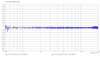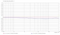 Werden die beiden Frequenzgänge der Messungen aufeinander gelegt (ohne Glättung und mit 1/3oct.) erkennt man nur wenig Abweichung (0,001 Einheiten der y-Achse entsprechen 0.1dB):