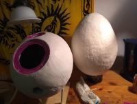 Das 2. Eigehäuse hat eben die erste Schicht (2.Hälfte) Pappmaché bekommen. Der Styroporkern ist noch drin.