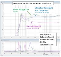 Die Simulation mit den Klang und Ton Daten ähnelt am ehesten der Messung in meinem Wohnraum. Fs wird dort mit 140 Hz gemessen. Das Tang Band Datenblatt geht von Fs = 110 Hz aus.