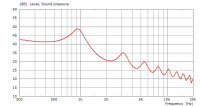 Während die 'ideale' Punktschallquelle in einer unendlichen Schallwand fehlerfrei abgestahlt hat, hat die 2,5cm Flachmembran - ebenfalls in einer unendlichen Schallwand - bei hohen Frequenzen über ca. 7kHz die zu erwartende Bündelung gezeigt. Der Frequenzgang war linear und es waren keine Resonanzen oder sonstigen Änderungen zu sehen.