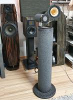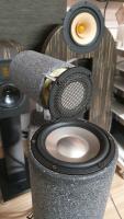 Die Passivmembran (ein defekter Vifa PLW 26 mit gestutzer Zentriespinne) war nicht unbedingt nötig, BR-Rohre hätten es auch getan. aber so konnte ich den "Mitteltönern" etwas Abstand zum Boden geben und die knapp 20 Liter Volumen unterbringen. Die Tiefmitteltöner sind eigentlich Subwoofer-Chassis (Omnes Audio SW 5.01). Hochtöner ist ein Peerless H25TG05-04, ein Zwitter zwischen PA und HiFi mit etwas Bündlung und genug Wirkungsgrad und Belastbarkeit um auch bei höheren Pegel cool zu bleiben.