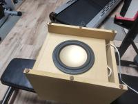 Zuerst habe ich die Parameter grob in eine ASCII-Datei übersetzt, ich weiß, Vituix kann das alles automatisch, aber leider läuft das Programm bei mir nicht( Linux Mint). Dann wurde Boxsim mit den Daten gefüttert und schließlich ein PAR20 in ein Testgehäuse eingebaut. Im Keller habe ich noch ein altes Lautsprechergehäuse für diesen Zweck mit etwa 60 Liter. Wenn ich die Box mit Büchern ausfülle, kann ich das Volumen reduzieren.