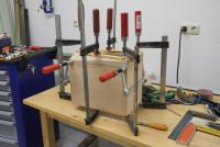 Anzumerken ist, dass die Präzision der vorgefertigen Zuschnittteile wirklich ausgezeichnet war, sodass es beim Verleimen der Teile keinerlei Schwierigkeiten gab. Die Seitenwände mit der "Klebeband-Verleimmethode" zusammengefügt, die Fronten und die Rückwand mit Leimzwingen eingepresst.