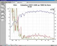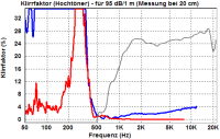 Hier zwei weitere Messungen des Hochtonhorns mit Weiche bei 95 dB/1 m mittleren Schalldruckpegels. Bei der ersten Messung stand das Mikrophon mit 20 cm Abstand vom Lautsprecher, bei der zweiten Messung 100 cm: