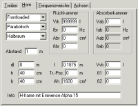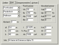 Man fängt mit einem frontgeladenen Horn an, das die Tiefe und den Querschnitt der vorderen H-Dipol-Kammer hat. Für die Rückkammer wird der von Christoph vorgeschlagene Maximalwert genommen (siehe erstes Eingabefenster). Heraus kommt die schwarze Kurve im Diagramm. Aus dieser Kurve entnimmt man den Wert der Resonanz und setzt ihn als fbr in das Feld "Rückkammer" ein. Der Wert der Frontöffnung Ah gilt natürlich auch für die Reflexöffnung Abr der Rückkammer. Aus Ah und "l" des Fronthorns ergibt sich zwangsläufig das Volumen Vrk der Rückkammer. "dl" ergibt sich nunmehr aus 2 x "l" plus der Dicke der Schallwand im H-Dipol (siehe zweites Eingabefenster). Ein Klick auf "Start" führt jetzt zur roten Kurve im Diagramm, die schön den Dipolabfall berücksichtigt. Das ganze habe ich für einen H-frame simuliert, den Martin J. King in http://www.quarter-wave.com/OBs/U_and_H_Frames.pdf beschreibt. Sein simulierter Frequenzgang von page 8 unten ist die blaue Kurve im Diagramm. Ich denke, die Übereinstimmung reicht für den täglichen Bedarf. Gruß, Rudolf