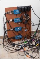 ![]() In letzter Zeit habe ich mich etwas intensiver mit der Lokalisation des Basses auf den Surrounds beschäftigt. Mit diversen (teilweise selbst generierten) Streams habe ich bemerkt, dass sich bei der Lokalisation des Basses auf den Surrounds eine Art Bruch auftut. Sprich: man merkt, dass der Bass von vorne kommt. Und das trotz inzwischen steiler Trennung (12. Ordnung) bei 80 Hz. Um das Problem abzumildern, habe ich ein zweites DBA im DSP konfiguriert, dass umgekehrt funktioniert. Das hintere Gitter ist hierbei also das primäre und das vordere das sekundäre. Die ADAU1452 lassen dank freier Konfigurierbarkeit sowas zu. Mit dem Sigma Studio ist das relativ einfach und übertragen wird das dann per USB. Die Konfiguration des DSPs für die beiden DBAs sieht dann so aus: [ATTACH=CONFIG]57967[/ATTACH] Der obere Eingang wird von dem Subwooferausgang der Vorstufe befeuert. Die übernimmt das Bassmanagement der drei Frontlautsprecher und gibt den LFE aus. Dann wird ein steiler Tiefpass angewendet (insgesamt 12. Ordnung), parametrische EQs folgen, die Phase wird per FIR linearisiert und am Ende wird an die Endstufen der beiden Tieftongitter ein symmetriertes Signal ausgegeben. Der untere Teil wird von dem S/PDIF-Eingang gespeist, der das summierte Signal der vier Surrounds annimmt, die der Surround-DSP als Kopie ausgibt. Auch hier wird wieder der Tiefpass angewendet, EQ, Phasenlinearisierung usw. Am Ende summieren sich die Signale der beiden DBAs an den Ausgängen. Im Surround-DSP sieht das dann so aus: [ATTACH=CONFIG]57966[/ATTACH] Hier wird gleich am Anfang das Signal abgegriffen und per S/PDIF weitergereicht. Auf die Surrounds wende ich dann den steilen Hochpass an, einen EQ, Phasenlinearisierung usw. Die Surrounds sind bei mir ja im Moment aktiv, aber analog. Nur für die drei Frontlautsprecher wird aktuell die Weiche per DSP realisiert. Linearphasig ist aber das gesamte System. Das heißt, insgesamt ergibt sich folgende Bild. Rot sind jeweils die aktiven Lautsprecher. Frontlautsprecher aktiv: [ATTACH=CONFIG]57965[/ATTACH] Surrounds aktiv: [ATTACH=CONFIG]57964[/ATTACH] Damit ergibt sich auf den seitlichen Surrounds eine bessere Lokalisation des Basses, da der Abstand zum hinteren DBA viel kleiner ist als zum vorderen. Der Bruch, der vorher bei bestimmten Signalen da war, existiert nicht mehr. Das ist definitiv eine merkliche Verbesserung. Für die Backsurrounds ist die Anordnung sogar ideal, da sie in derselben Ebene liegen wie das hintere Tieftongitter. Wenn man sich umdreht und dort Stereo-Musik draufgibt, hört es sich richtig gut an. Was übrigens interessant ist: ich musste den Equalizer und Phasenlinearisierungen für das hintere DBA nicht verändert. Einzig Pegel und Verzögerung musste ich anpassen. Der Amplitudengang passte dann automatisch schon sehr gut. ![]() [ATTACH=CONFIG]57963[/ATTACH]