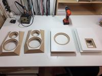 Ausser der Front (40mm) hab ich das Gehäuse auf Gehrung gefräst. Klassisch mit Packklebeband verleimt, gespachtelt und verschliffen.
