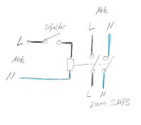 Hier mal ein Plan für das Relais. Zur Relaisspule und zum Schalter reicht 0,5 mm² dicke. Da, wo die Relaiskontakte sind gehst Du mit min 1mm² drauf und ab. Setz das Relais in der Nähe Netz und SMPS. Dann brauchst die 230 Volt nicht durch Gehäuse zu führen, außer L zum Schalter und zurück. Der N geht ja auch zur Spule