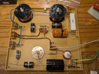 Weiterhin will ich das RC Glied im TMT Zweig von 12 Ohm und 100µF auf 6,8 Ohm und 270 bis 330µF ändern. Widerstände habe ich reichlich, große Kondensatoren leider kaum noch. Vorhanden wäre ein bipolarer Elko mit 300µF aus einer alten KEF Box ausgelötet. Der hat aber nur 25V Spannungsfestigkeit. Das wiederum würde mich nicht stören, wenn denn nicht der Verlustfaktor entsprechend hoch wäre und der Kondensator von den Abmessungen sehr klein. Trotzdem riskieren? Mit nur 6,8 Ohm in Reihe geht da ja schon ein wenig Strom drüber (falls man mal etwas aufdreht, das ist bei dem Wirkungsgrad aber wiederum nicht wirklich notwendig).