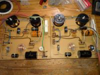 Die Weiche habe ich nach der ersten Hörsession noch etwas umgebaut. Der Grundton war zu prominent, der Hochton aggressiv und der Überschwinger bei der Trennfrequenz störte mich auch. Da ich ausschließlich auf vorhandene Bauteile zurückgreifen wollte, sieht das jetzt so aus: