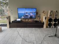 Bass und Mittelton sind mit 2 DSP aktiv getrennt (LR24) und nach Einmessung entzerrt, die Trennung Mitten/Höhen geschieht passiv. Ich verwende dazu den 4-Kanal-Verstärker der "HiFiAkademie". Kein Ploppen beim Einschalten oder Rauschen (Kennschalldruck der LS 90 dB).