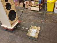 Messabstand 3 m, Box am Boden auf einem Möbelhund als Drehteller mit dem Mikrofonhalter als Zeiger für die Winkel und als halbwegs fixe Fixierung: