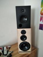 Die Gehäuse sind aus MDF gebaut und mit verdüntem Warnex gerollt, evtl. gebe ich nochmal eine gröbere Schicht drauf. Die Anschlüsse habe ich per Speakon-Buchse gelöst. Das mache ich ab jetzt immer so, sieht edler aus als Litze und lässt sich wunderbar an- und abstecken. Dafür, dass es Recyceltes Holz aus früheren Lautsprechern war und mein erster Versuch, die Gehäuse auf Gehrung zu sägen, bin ich zufrieden. So perfekt wie in Post 100 ist es noch lange nicht (da wüsste ich gerne mal, wie sowas zu Hause geht). Dank der neuen Kantfräser und der Schattenfuge machen meine Teltow dennoch einiges her. Die optische Qualität der Chassis nicht zu vergessen. Einzig die Bassreflexrohre ärgern ich, die Versenkung hat nicht hundertpro hingehauen. Die Lösung aus Post 100 gefällt mir wesentlich besser.