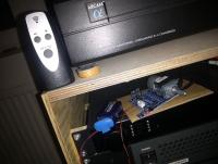 Für die Fernbedienbarkeit der Lautstärke gibt es ein Provisorium. Die Platine hängt an einer 9Volt Batterie und ist in das durchgeschnittenes Cinchkabel gelötet, welches von der Eingangsumschaltbox zur Endstufe führt.