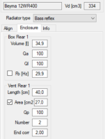 Was für mich immer noch eine Geschichte voller Missverständnisse ist, ist der BR-Korrekturfaktor. Da die Kanäle die ganze Höhe der Box einnehmen sollte ich bei 2,27 landen, richtig? Wenn Ich die 53cm² auf zwei Schächte mit (32cm minus zwei Leisten 1cm) = 30cm Höhe verteile lange ich bei knapp 9mm Kanalhöhe bzw. in diesem Fall Breite. Onken nach hinten? Irgendwie so, oder?