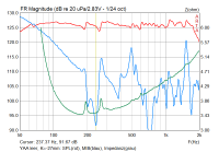 Zum Schluss noch der Vergleich der Frequenzgänge (Nahfeld) ohne Dämpfung, mit sehr leicher Dämpfung und etwas mehr Dämpfung (wie oben gezeigt):