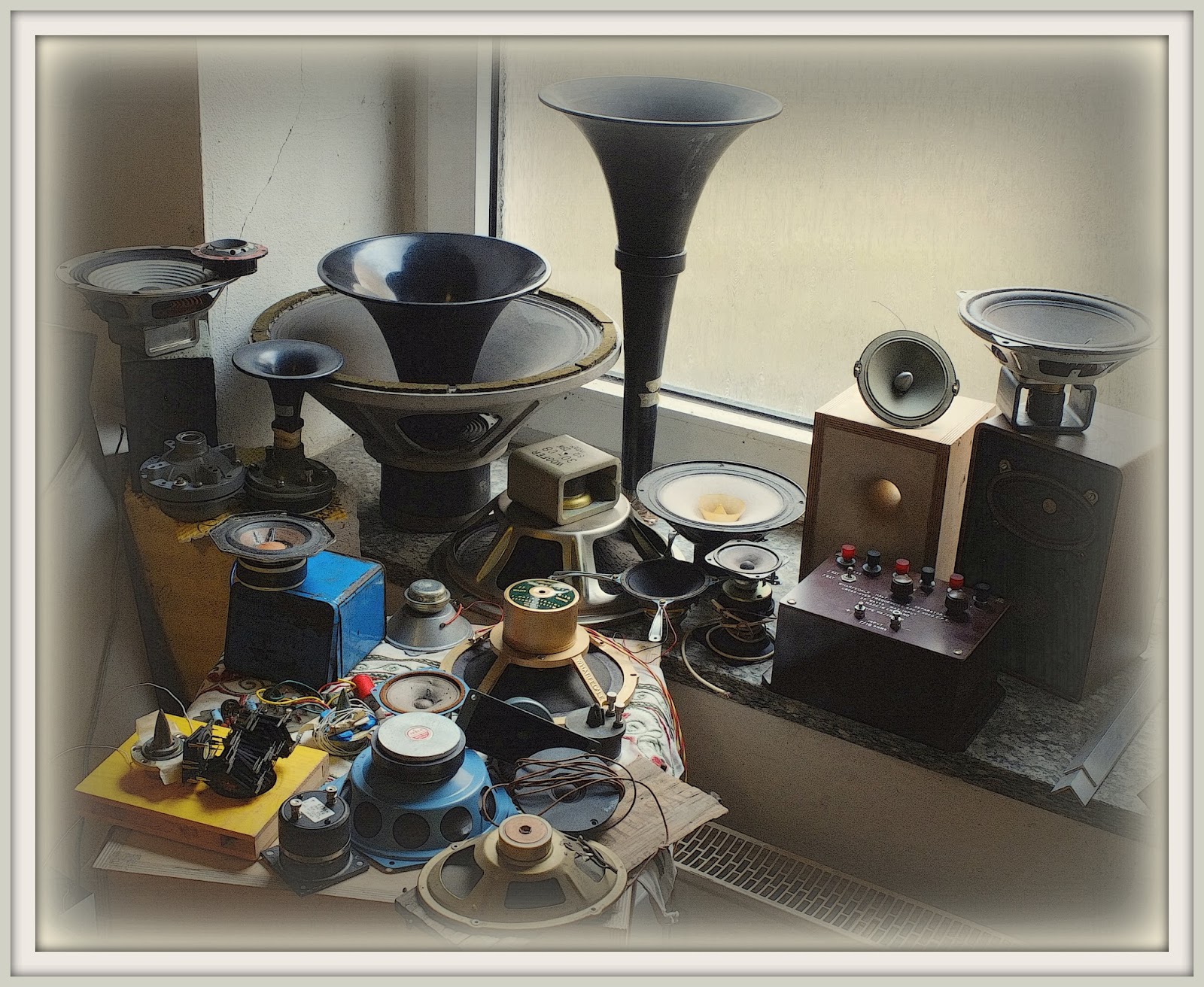 Auf dem Foto ist nur ein Teil, es liegen noch viele Teile im Lager...Eigenes Packmaterial mitbringen. Von Rema bis akai Tuner zB. 10 Stück Fostex Fe83 (allerdings aus meiner Beschichtungsphase....) 120 Stück Philips 600 Ohm, je 12 Stück auf einem Brett. 72 Stück sind in einem grooossen gefalteten Subwoofer. Gehäuselos, aber schwer wie Holz. usw etc pp.