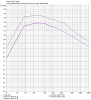 So, hier das ganze mit dem Eminence Aplpha 15A (einfach mal in das slebe Gehäuse eingefügt, auch wenn das praktisch aufgrund der anderen Größe nie passen würde). Die gestrichelten Linien zeigen das ganze noch mit dem Scan Peak.