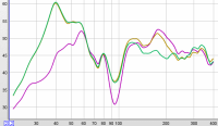 Dazu habe ich an meinem Hörplatz 320cm entfernt auf 100cm Höhe gemessen. Gelb ist hierbei das normale U-Frame (U ist nach hinten offen). Bei Grün sind die Seiten nach innen angewinkelt. Bei lila sind zur Seite geöffnet:
