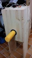 1. Zunächst baute ich ein geschlossenes Testgehäuse mit leicht abschraubbarer Rückwand. Mit 32ltr viel zu groß für einen 20er Bass. Über 1ltr-Einlege-Styroporplatten verkleinerte ich das Volumen der leeren Box nach und nach. Ein verschiebbaren Einstellstopfen ermöglicht das äußere Verändern.