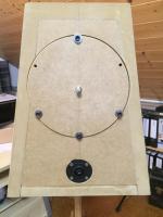 Ich bildete mir ein, als erstes die Aufweitung für den Tieftöner herzustellen. Die Bohrungen angezeichnet und meine Oberfräse angeworfen. Als nächstes habe ich die Ausschnitte für die beiden Chassis und Passivmembran herausgefräst. :denk: Halt STOP, die Passivmembran ist zu groß für sofortiges fräsen. Also nur die Front gefräst. Anschließend stellte ich fest, die Aufweitung geht besser, wenn der Chassis-Ausschnitt (Eiinbaudurchmesser) bereits hergestellt ist.