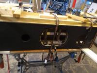 Die Gehäuse sind 106,5cm hoch, 30cm breit und 35cm tief (außen). Die Seitenwände sind auf den Bilder ausgeblendet. Die Seiten werde ich aus mehreren Lagen Pappelsperrholz auf dem Gehäuse in die Rundung biegen. Ich denke selbst mit mehreren 4mm Platten sollte das gehen, denn der Radius ist mit ca. 1m recht human und ich habe hoffentlich genug Rippen als Auflagen. In der Skizze sieht man noch das aktuell ein IHA geplant ist. Dieser ist auf die Gehäuseresonanz in der Vertikalen abgestimmt und besteht nur aus einem Trennbrett (19mm) mit 75mm durchmessendem Loch. Der IHA selber hat circa 10% des gesamten Tieftonvolumens, in Zahlen 6,8 Liter. Das gesamte Tieftonvolumen inkl. IHA beträgt circa 66 Liter. Hoch und Mittelton haben eine eigene gemeinsame Kammer. In dieser ist ein wahlloser Diffusor eingezeichnet der den rückwärtigen Schall des Breitbänders verteilt. Zum einen weil ich ausgeschäumte DN110 Rohre habe die ich nur durchschneiden muss, zum anderen weil ich Volumen übrig hatte. Ob es viel bringt oder nicht, sehen wir dann mal.