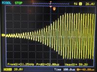 Jeweils gemessen am OUT+ vom fiependen Board. Die Interne Arbeitsfrequenz ändert sich auf 31,25kHz und die komplette Netzteilspannug wird durchgeschalten (eben im Test hatte ich das ThaiSMPS mal angeschlossen)