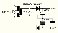 Also wirklich nix großartiges, größter Verbraucher ist das Netzrelais wenn der Betrieb aktiviert ist. Die Timer und Schaltschwellen in der Schaltung beziehen sich zwar auf +/-10V, aber wenn's "a bisserl mehr ist" geht die Welt wohl nicht unter, darum müsste ein 7,5 V (statt 7,2V) Trafo, der im Leerlauf (...dicker Daumen...) 10,5V statt 10V macht trotzdem noch passen - ja?