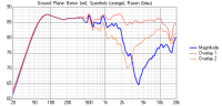 Große Abweichungen zeigt wie vermutet die Groundplane-Messung mit Chassis nah am Boden. Hier scheint die virtuell nach unten verlängerte Schallwand (und ggf. auch die (verrundete) Kannte zwischen Schallwand und Boden) deutlich ihren Einfluss zu zeigen. Das zu messen kann wohl auch sinnvoll sein, wenn das Chassis z.B. unter tatsächlichen Betriebsbedingungen bodennah eingebaut wird.