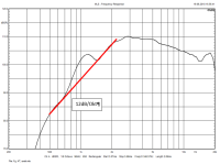 Zunächst einmal müssen wir festhalten, dass dies auch in Franks Messungen zu sehen ist und es keine Senke bei 1,5kHz ist, sondern eher eine Überhöhung bei etwa 1,2kHz. Sieht man recht gut, wenn man eine 12dB/Oktave fallende Gerade einzeichnet: