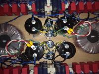 "normal" bin ich bei 1A pro Transistor, per Jumper (die könnte man auch ans Bedienfeld rausführen) kann ich auf 20mA pro Transistor drosseln. Die zwei Arbeitspunkte sind frei wählbar, wer mehr Kühlleistung zu bieten hat kriegt an 4 Ohm 200 W in Class A geknackt. Die Sinus-Ausgangsleistung ist bis 1 Ohm Lastimpedanz nur vom maximalen Spannungshub (gebrückt 40Vpp) und der Kühlung begrenzt, mit den Transistoren könnte man auch schweißen