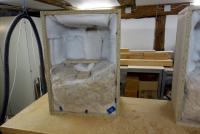 An die Seiten kamen dann noch 3cm dicke Hanfmatten (Sanierungsreste), welche mit Polyestervlies abgedichtet wurden. An das zweite Seitenteil (ohne Bedämpfung verleimt) wurde später von innen noch Filzmatte geklebt - am Bild rechts zu erkennen.