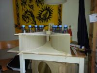 Pläne sind im Anhang. Die Hornkontur einfach ohne Skalierung zwei Mal auf A3 ausdrucken, ausschneiden und zusammen kleben, fertig ist die Schablone. Die Pläne für's Altec 614 Gehäuse gibt's im Netz. Reflexkanal ist, inkl. Schallwand, 16cm lang.