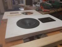 Anbei noch ein paar Bildchen von der AM25 Frässchablone, und der Rückseite mit der Passiv Membran von SEAS