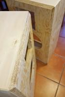 Hier im Beispiel hatte ich oben auf das Gehäuse ein 4mm Sperrholzbrett (Pappel) geklebt, damit man die Stöße nicht sieht. Dafür sieht man jetzt die Spur des Fräsers