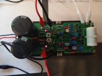 Hat man bis hier hin alles gut überstanden, wird der Ruhestrom eingestellt. Zunächst die Eingänge der Endstufen kurzschließen, dann müssen zwischen den Messpunkten auf der Platine 24mV anliegen. Also Multimeter ran und behutsam im Gegenuhrzeigersinn am Poti des Widerstands R22 drehen, bis sich die Spannung langsam Richtung Ziel bewegt. Bei mir dauert es sicher ein paar Minuten, bis der Wert in etwa konstant bleibt. Hoffe, das ist normal?