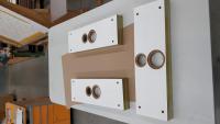 Für mich als Tischler eher von Interesse: Die Gehäuse werden komplett auf Gehrungen gefaltet um wieder beim Lackieren Zeit zu sparen. Zudem Werden die Seitenteile mit Makassar-Furnier belegt. Um die Treiber zu schützen und um die Ansicht der Boxen abzurunden wird noch ein Frontgrill mit schlichtem schwarzen Stoff gefertigt.
