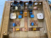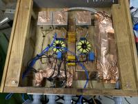In diesem Aufbau hatte ich noch keinen Nachfilter im dritten Kanal für den Subwoofer. Später wurde dieser noch nachgerüstet. Zum generellen Aufbau: rechts unten wird eingespeist. In dem Kupferblech wird die Verteilung auf das geschirmte Kabel erzeugt und ein großflächiger PE Abgleich. Die 4eckigen Weißblechdosen sind wieder mit Kupferleitpaste auf die gereinigten Schienen geschraubt und sind für die HF Filterung verantwortlich. Die Nachfilter glätten dann nur noch.