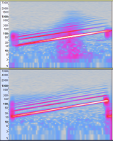 Ich habe noch mal mit den gleichen Pegeln im Nahfeld an der Membran gemessen. Direkter vergleich BR (oben) und Membran (unten) bei hohem Pegel: