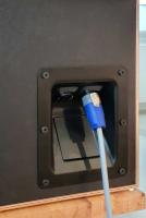 Ein vielleicht interessantes Detail ist das Anschlussterminal von Adam Hall. Das versenkt die sehr langen Speakon-Stecker weitgehend und nimmt nach innen auch nicht viel Volumen. Es nimmt zwei Buchsen auf, die parallel oder seriell verschaltet werden können. Die Neutrik-Buchsen an sich können mit separaten Dichtungen von Neutrik montiert werden.