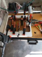 Die Hartfaserpappe ist etwas dünne. Also Resteholz verklebt