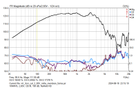 Außerdem verschiebt sich die zweite Resonanz (1,2 kHz beim HF94), 1,7 kHz beim ME90. Ohne Horn liegt sie bei 2,1 kHz. Da zeigt sich wie das Horn die elektr. Impedanz des Treibers überform. Die Resonanzen >10 kHz kommen von der Membran, die dann aufbricht.