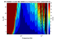 Zunächst K2 (erste Abbildung) bzw. K3 (zweite Abbildung für das HF94. Die Darstellung erfolgt als Frequenz auf der x-Achse, angelegte Spannung auf der y-Achse und K2/K3 als farbliche Kodierung.