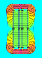 ich hab mich endlich mal mit FEMM beschäftigt und mich durch die frickelige Eingabe gearbeitet, um eine Idee für eine Mittelhochtoneinheit mit Bändchenmembranen zu simulieren. Dabei kam folgendes raus: