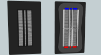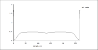 Mangels besseren Wissens habe ich das ganze folgendermaßen simuliert: Die Magneten sind Neodym-Magneten mit den Maßen 40x10x5 mm, in zwei Reihen und jeweils sechs übereinander, so dass eine Magnetreihe die Gesamtmaße 240x10x10 mm hat. Mittig ist ein 3 mm breiter Spalt, der durch die lokale Abschwächung des Magnetfelds die Grundmode des Bändchens weniger anregen soll. Der Eisenträger besteht aus "US Steel Type 2-S 0.018 inch thickness", was auch immer das heissen soll. An den Enden ist jeweils ein 1 cm tiefer Einschnitt, in der das Bändchen befestigt werden kann. Die Tiefe der Simulation beträgt 10 mm.