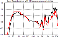 von dem ECM 8000 wurden insgesamt 4 Stück aus unterschiedlichen Bezugsquellen getestet. Vom Beyerdynamic MM 1 wurden lediglich zwei Exemplare getestet, die sich in der Empfindlichkeit um 1 dB unterschieden. Hier die Freifeldfrequenzgänge zweier Beyerdynamic MM 1 (Nachgezeichnet mit SplTrace):