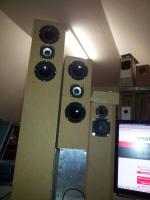Auf dem oberen Bild sind noch W3-315 verbaut die aber getauscht wurden da mir der Klang nicht ansatzweise gefallen hat. Im Hintergrund sind auch noch ein paar Gehäuse anderer Lautsprecher zu sehen die ich gebaut habe. Rechts daneben steht eine Zweiwege TQWT mit Visaton bestückung, 1/2 Eigenbau und 1/2 unbeabsichtigt zusammengeklaut.