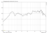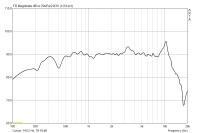 Eine interessante Beobachtung: dieser Treiber ist so klein, dass bereits die Öffnung in einer 19 mm dicken Spanplatte als Helmholtzresonantor im Nutzband fungiert und eine schöne Resonanz herbeizaubert. Daher habe ich diesen Treiber (und andere kleine) extra in einer dünnen Sperrholzplatte gemessen. Damit war von der Resonanz nichts mehr zu sehen.