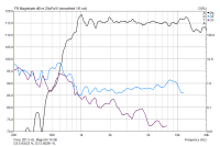Ich krame den Thread noch mal hervor, um ihn mit meinen Messungen eines Exemplars anzureichern. Gemessen wurde in 1 m Entfernung. Der Treiber wurde grob entzerrt, da der Amplitudengang sehr merkwürdig ist. Außerdem habe ich eine bedämpfte Rückkammer aus Pappe rangebastelt (naja, hingepfuscht .